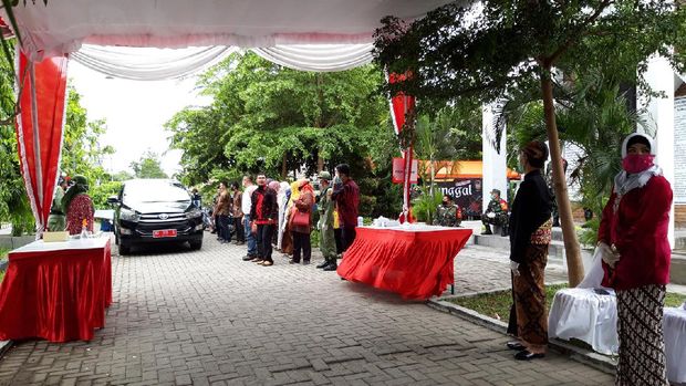IDWS, Selasa, 27 Oktober 2020 - Simulasi ini dibuat semirip mungkin dengan pelaksanaan hajatan pernikahan drive-thru sesungguhnya. Ada sepasang pengantin, among tamu hingga hiburan musik. Mereka juga mengenakan pakaian pengantin layaknya di sebuah acara pernikahan. Simulasi yang dilaksanakan yakni hajatan model drive-thru atau banyu mili.