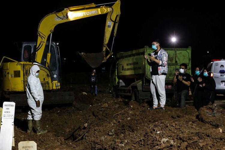 Suasana pemakaman jenazah Covid-19 di TPU Rorotan, Jakarta Utara, Kamis (24/6/2021). Meningkatnya kasus kematian Covid-19 mengakibatkan kesibukan pemakaman di TPU Rorotan hingga malam hari. Sedikitnya 79 orang dimakamkam hari ini.(KOMPAS.com / KRISTIANTO PURNOMO)