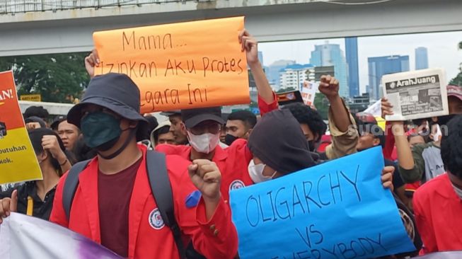 Massa aksi dari Aliansi Mahasiswa Indonesia menggelar aksi unjuk rasa di Kawasan Patung Kuda, Silang Merdeka Barat Daya, Gambir, Jakarta Pusat, Kamis (21/4/2022). [Suara.com/Yaumal]