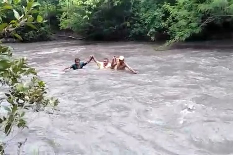 Tampak Pelaksana Tugas Kepala Sekolah Dasar Negeri Lumbung, Fransiskus Xaverius Geroda (tengah) dibantu oleh dua orang warga saat hendak menyeberangi Kali Maidang, Desa Maidang, Kecamatan Kambata Mapambuhang, Kabupaten Sumba Timur, Nusa Tenggara Timur (NTT), Kamis (28/1/2021) siang.(KOMPAS.com/TANGKAPAN LAYAR VIDEO)