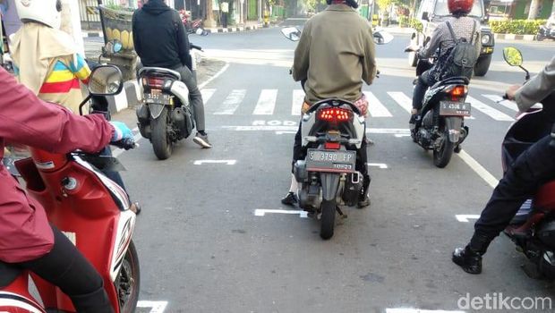 Inovasi di kawasan simpang empat ini, petugas dishub dan polantas membuat area khusus dengan ukuran 4x5 meter, persis di barat sebelah traffic light. Garis antar pengendara dibuat jarak 1,5 meter.