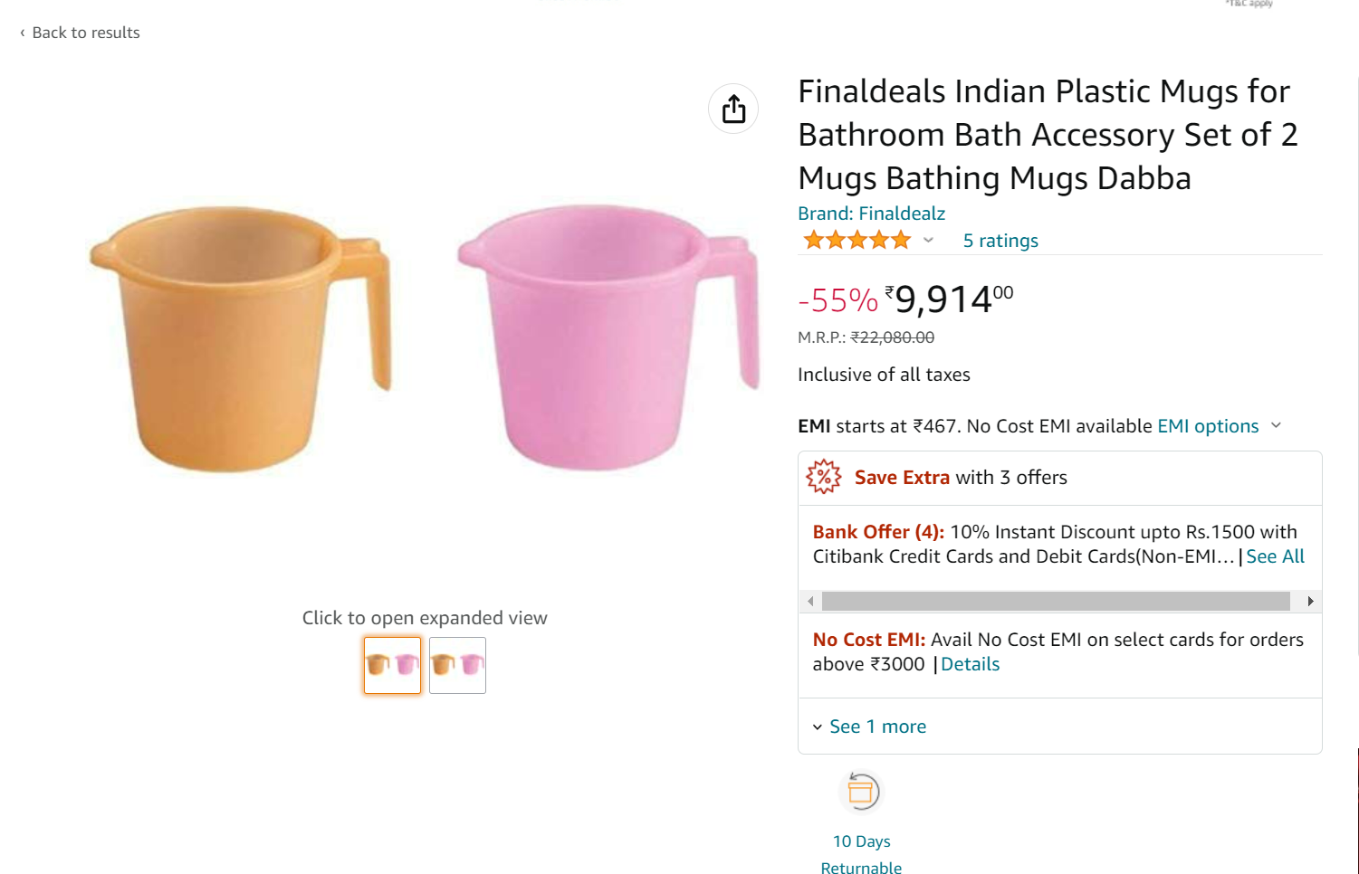 Rupanya kasus barang sehari-hari berharga tak wajar seperti ember plastik di atas bukanlah satu-satunya di Amazon. Ada juga kasus lain di mana satu gelas plastik untuk penggunaan di kamar mandi dijual sebesar Rs 22.080 atau sekitar Rp 4,1 juta.